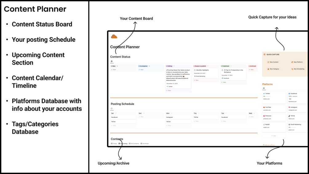- Description: The Platforms Database is a centralized repository of information about your various online platforms. Keep track of account details, engagement metrics, and platform-specific nuances. Whether it's social media, blogs, or other channels, having a comprehensive overview in one place ensures a holistic approach to content planning and distribution.