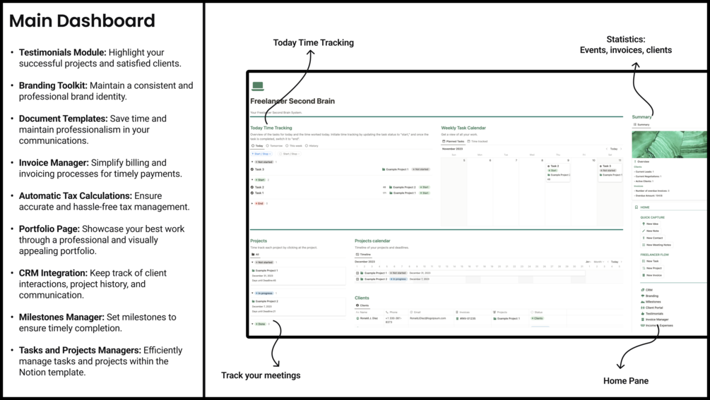 Want to improve your freelance business and productivity? This Notion template, designed for freelancers, can help. It's created to help you succeed with amazing features that will improve your freelance work: