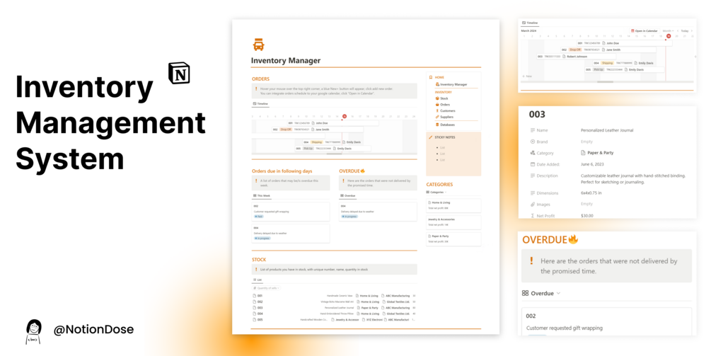 Inventory Management System – a powerful Notion template designed to help you efficiently organize and track your business's stock, orders, customers, and suppliers. This template offers a user-friendly and customizable space to monitor your inventory and well organized your operations, making it perfect for small businesses, retailers, and e-commerce stores.