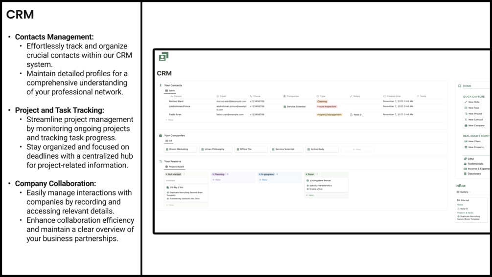 Elevate your real estate game with our comprehensive Real Estate Agent Second Brain Notion template. Streamline your workflow with an extended CRM, AI Assistance for property listings, efficient note management, a matcher to align clients and properties, projects and tasks board, a crucial contacts book, and robust trackers for Income & Expenses as well as income goals. Organize your business with ease and build a powerful client database. Take your real estate endeavors to new heights with this all-in-one Notion template.