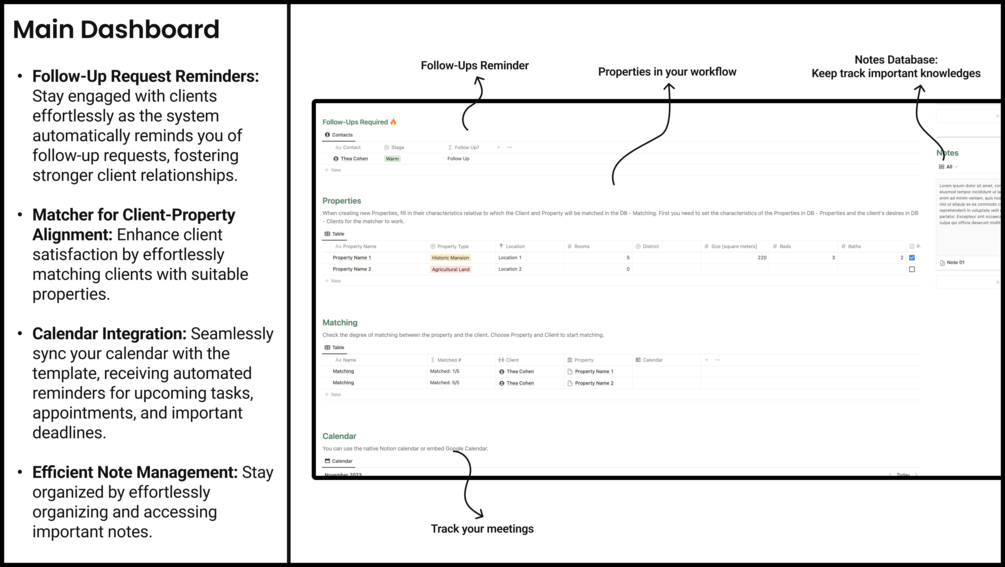 Elevate your real estate game with our comprehensive Real Estate Agent Second Brain Notion template. Streamline your workflow with an extended CRM, AI Assistance for property listings, efficient note management, a matcher to align clients and properties, projects and tasks board, a crucial contacts book, and robust trackers for Income & Expenses as well as income goals. Organize your business with ease and build a powerful client database. Take your real estate endeavors to new heights with this all-in-one Notion template.