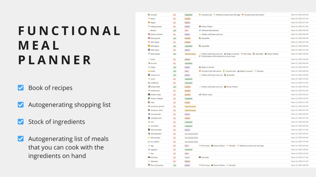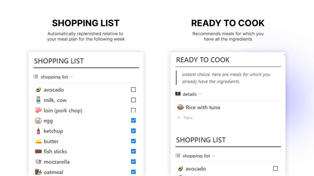 A functional and minimalistic template that will generate a shopping list and suggest meals with the ingredients you have